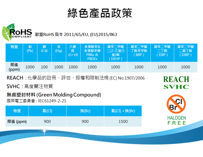 在全球推動環保意識下,我們重視日漸嚴重有害物質的污染,而影響到我們人類賴以生存的地球環境下,在歐盟地區為此制定了環保國際標準,有賴全球統一推動執行,因此自西元 2006 年 7 月 1 日起凡任何電子及電機類產品及設備均符合歐盟 RoHS(Restriction of the use of certain Hazardous Substance)環保標準,否則產品將無法在歐盟地區內銷售,RoHS 環保標準指出產品禁用含有鉛、汞、鎘、六價鉻、聚溴二苯醚(PBDEs)及聚溴聯苯(PBBs)等會產生危害地球環境的有害物質,列入管制範圍,其主要目的是削減產品使用有害物質所造成的汙染源。