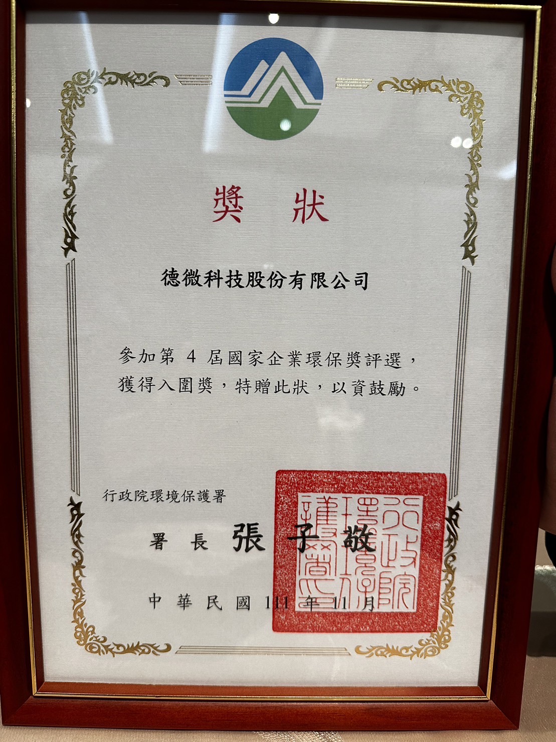 代表國家最高環保榮譽獎項的「第四屆國家企業環保獎」評選結果於15日公開表揚。德微科技以首次參加之姿,得到各評選委員青睞,榮獲獎項,後續將持續推動各項環境永續政策,共同為地球的環境盡一份心力。