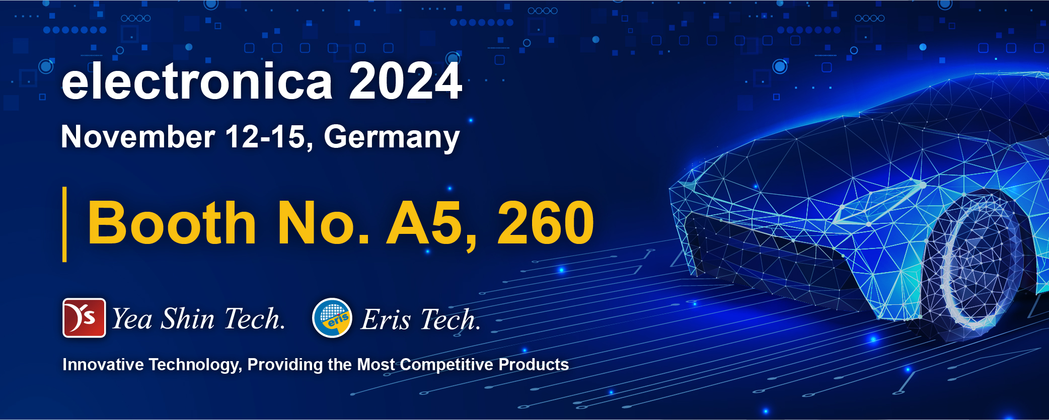 We are grateful your visit at the Eris booth in Electronica Munich, Germany, 2024.electronica Germany 2024. (Munich)Fair Date : November 12–15, 2024 (Tuesday–Friday)Opening Hours : 11/12-11/14,09:00-18:0011/15,09:00-15:00Location : Messe MünchenHall : A5, 260