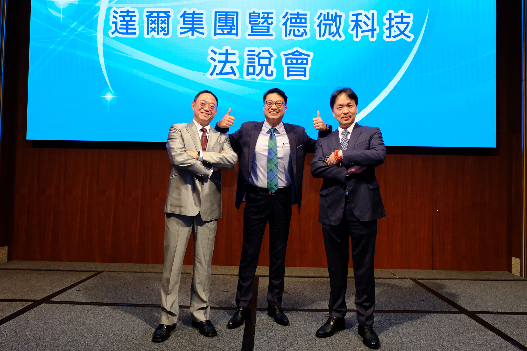 德微5日暫停交易,並由德微董事長張恩傑 (左)、達爾全球營運長虞凱行 (中)、德微執行副總朱鴻鈞 (右) 在櫃買中心召開重大訊息說明會,宣布擬斥資不超過新台幣8億元併母公司達爾的基隆廠。