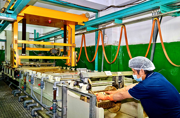 在切彎腳製程完成之後,進行在引線腳表面電鍍一層錫以匹配焊接性及防護氧化。