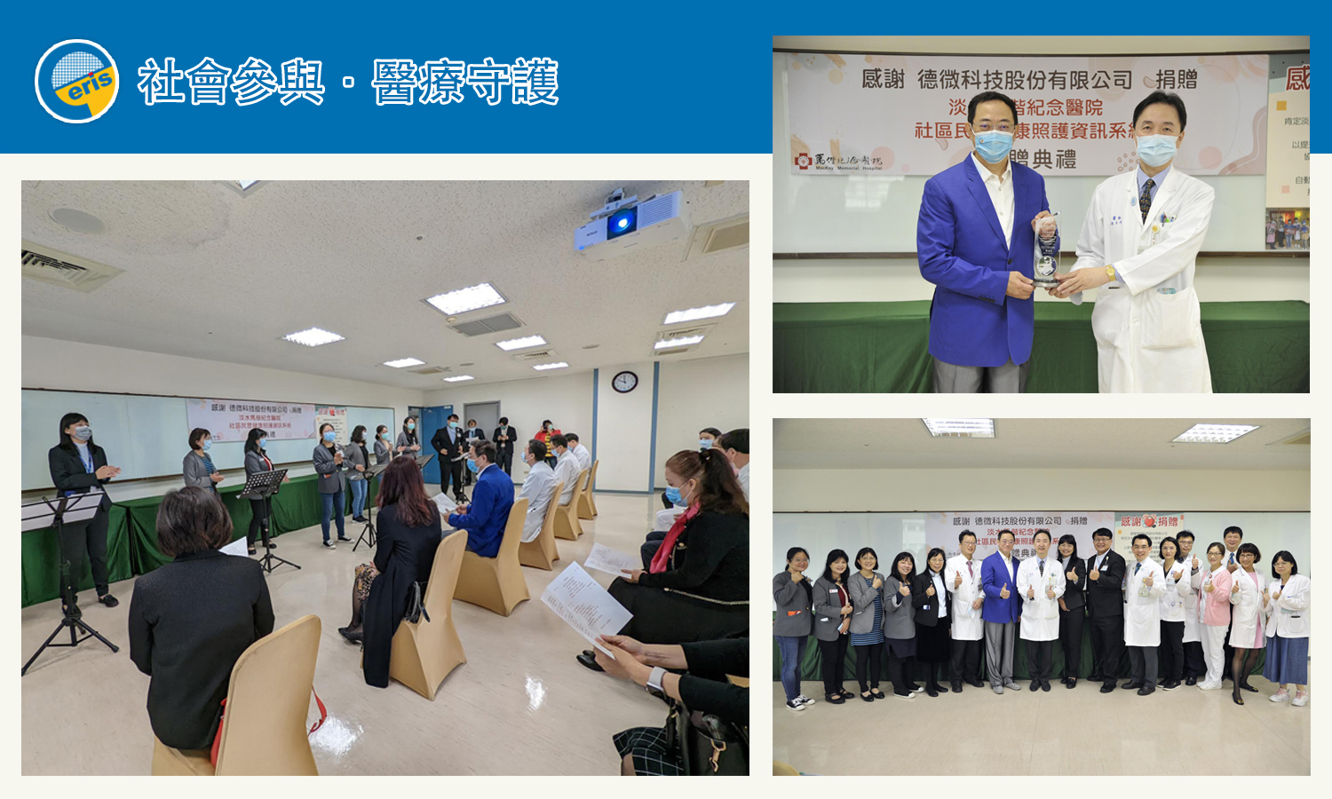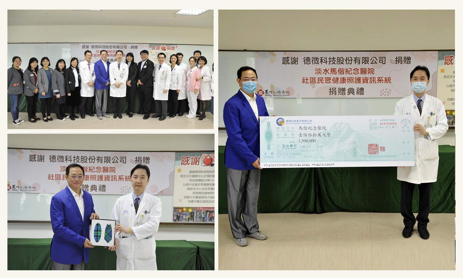 德微科技與淡水馬偕醫院同屬新北市區域,衷心期盼藉由協助淡水馬偕醫院,以提升新北市偏鄉地區醫療設備將醫療資源透過醫院之專業回饋社會, 讓預防醫學可以真正落實在每個社區給予及時的幫助。