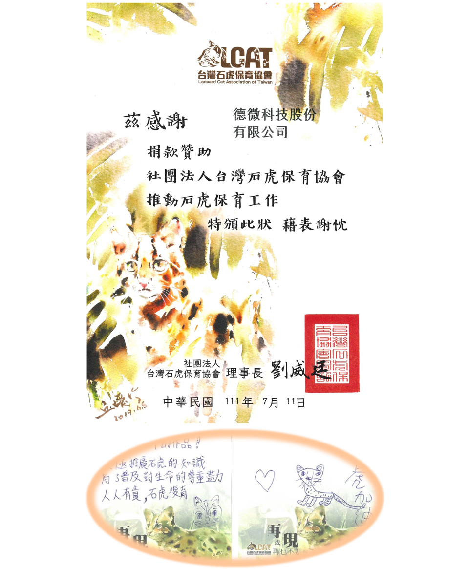 德微科技於2022年07月捐贈新台幣35萬元,贊助台灣石虎保育協會辦理推廣活動。石虎保育並非「只要當地人這樣做」就能解決;因淺山地區的豐富生態是大眾所共享的,是身處在這塊土地的每個人都需要學習與生態平衡共生共融。
