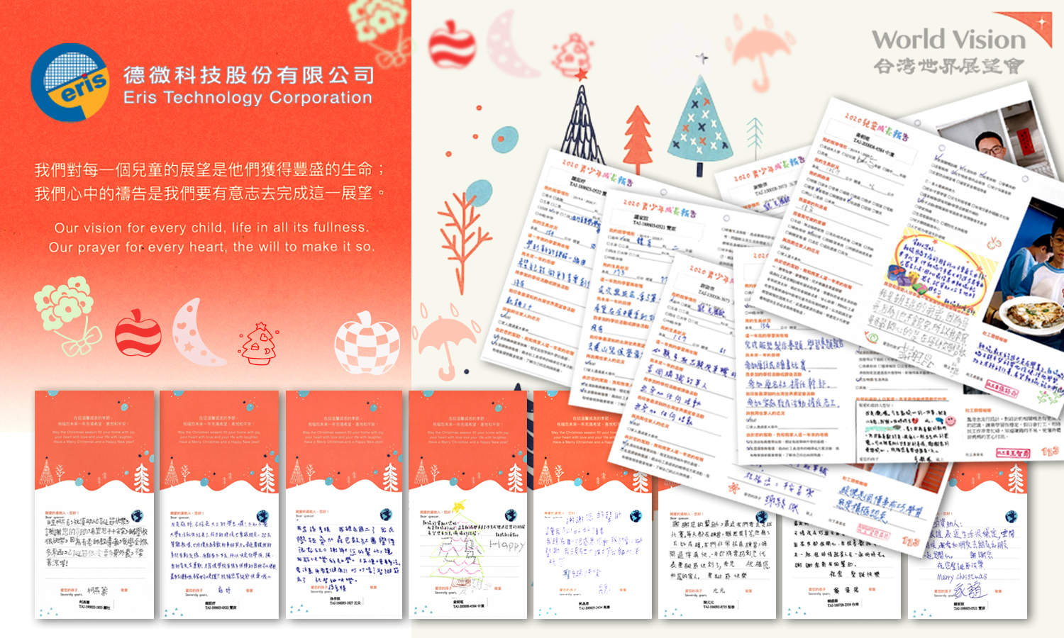 「栽種希望」專案活動,仍持續至今(15年),德微科技仍本著初心繼續參與世界展望會的孩童助學計劃, 2025年我們參與世界展望會助學行動之金額為新台幣約10萬元。這十幾年來同仁們扶持弱勢家庭孩童的心,不間斷的同時,也讓每位參與的同仁, 從孩子們寄來的問候卡片中,感受到孩子們在求學與生活中的點點滴滴,使我們的心備受安慰。